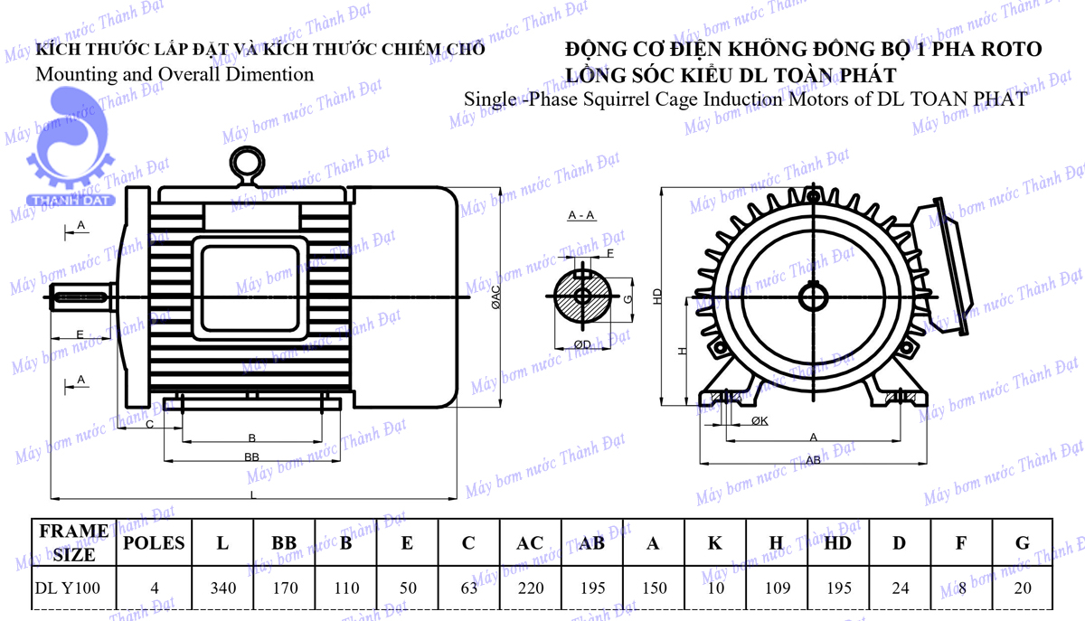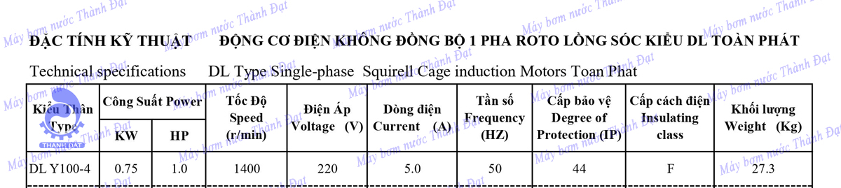 Bảng thông số kỹ thuật động cơ điện Toàn Phát DL Y100-4 1HP 0.75KW 1 pha