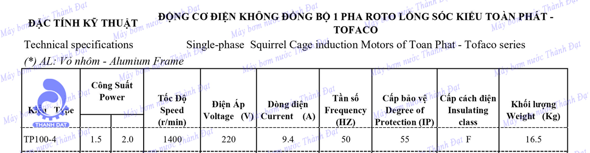 Bảng thông số kỹ thuật động cơ điện Toàn Phát Tofaco TP100-4 2HP 1.5KW 1pha