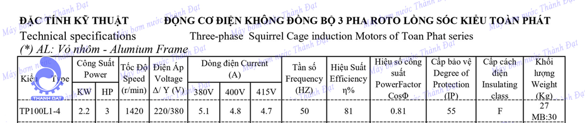 Bảng thông số kỹ thuật động cơ điện Toàn Phát TP100L1-4 3HP 2.2KW 3 pha