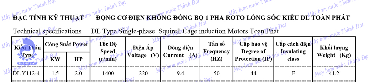 Bảng thông số kỹ thuật động cơ điện Toàn Phát DL Y112-4 2HP 1.5KW 1 pha