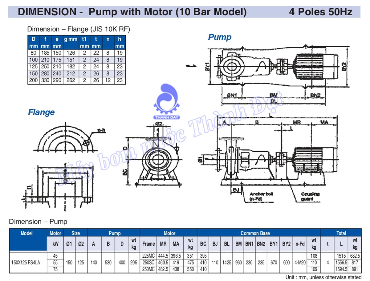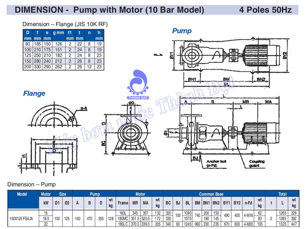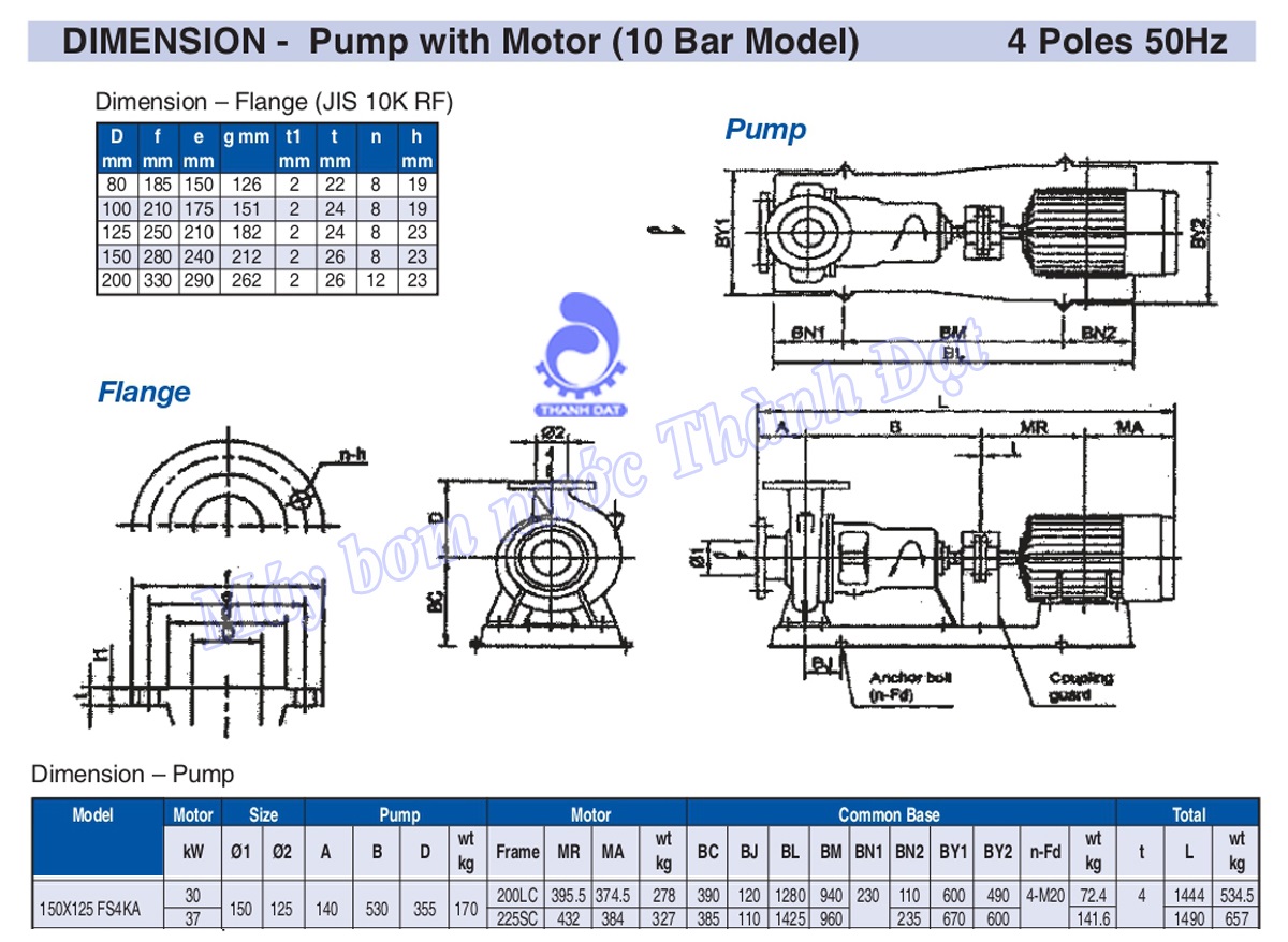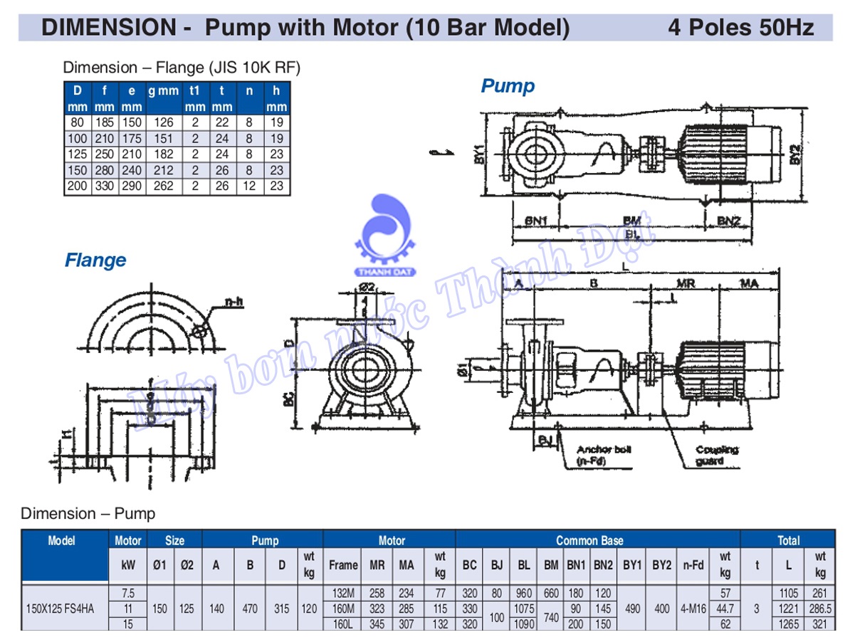 Thông số kỹ thuật chung của bơm rời trục Ebara 150×125 FSA