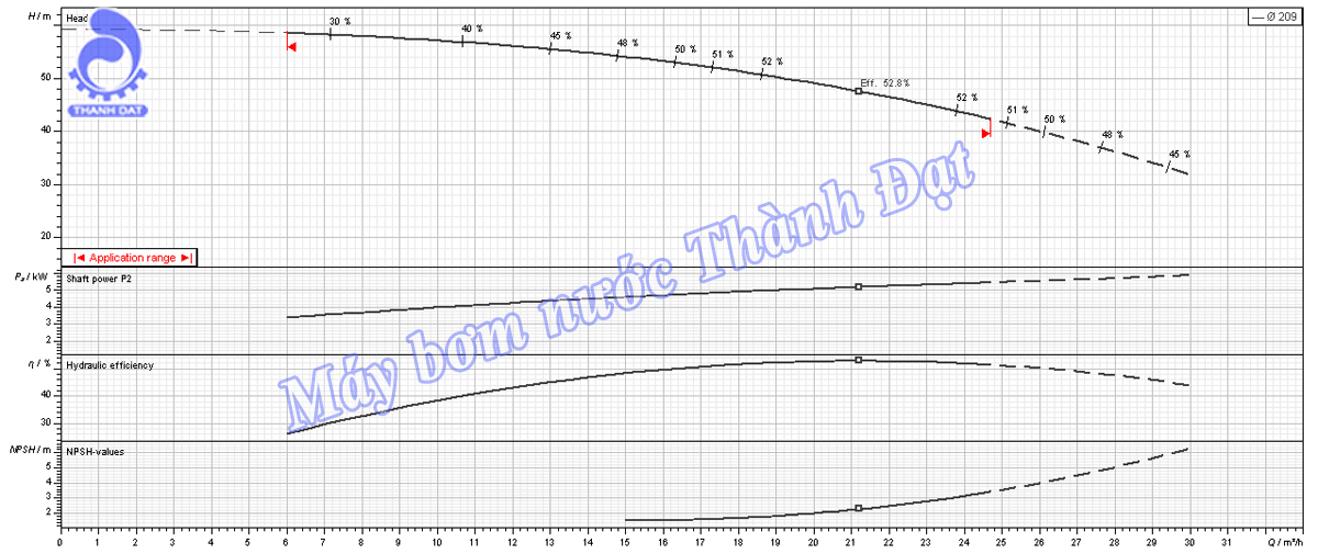 Bảng lưu lượng, cột áp của máy bơm Ebara 50×40 FS2HA 5 5.5