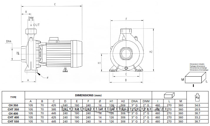 Bảng thông số chi tiết kích thước của máy bơm nước Pentax CH350-550