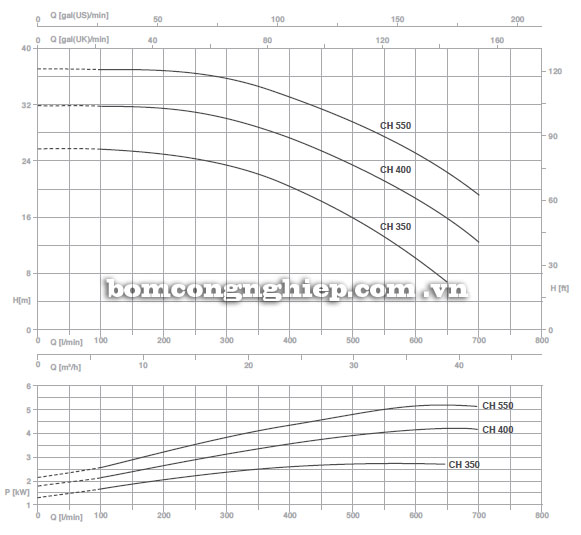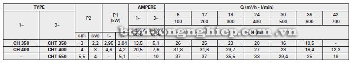 Bảng thông số kỹ thuật chi tiết lưu lượng cột áp của máy bơm nước Pentax CH350-550
