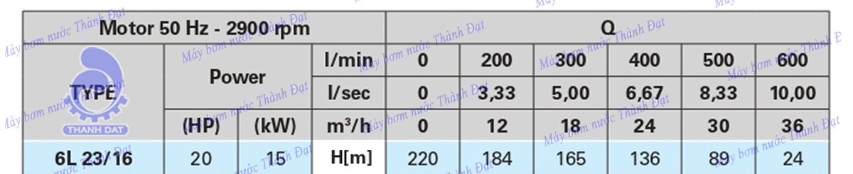 Bảng thông số kỹ thuật máy bơm giếng khoan Pentax 6L 23/16 20HP