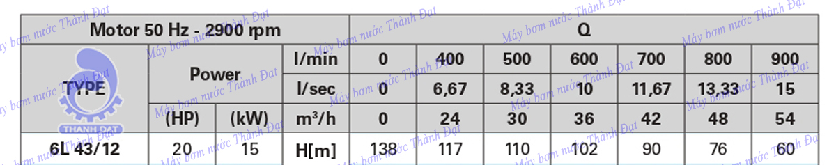 Bảng thông số kỹ thuật chi tiết lưu lượng cột áp của Máy bơm chìm Pentax 6L 43/12 20HP