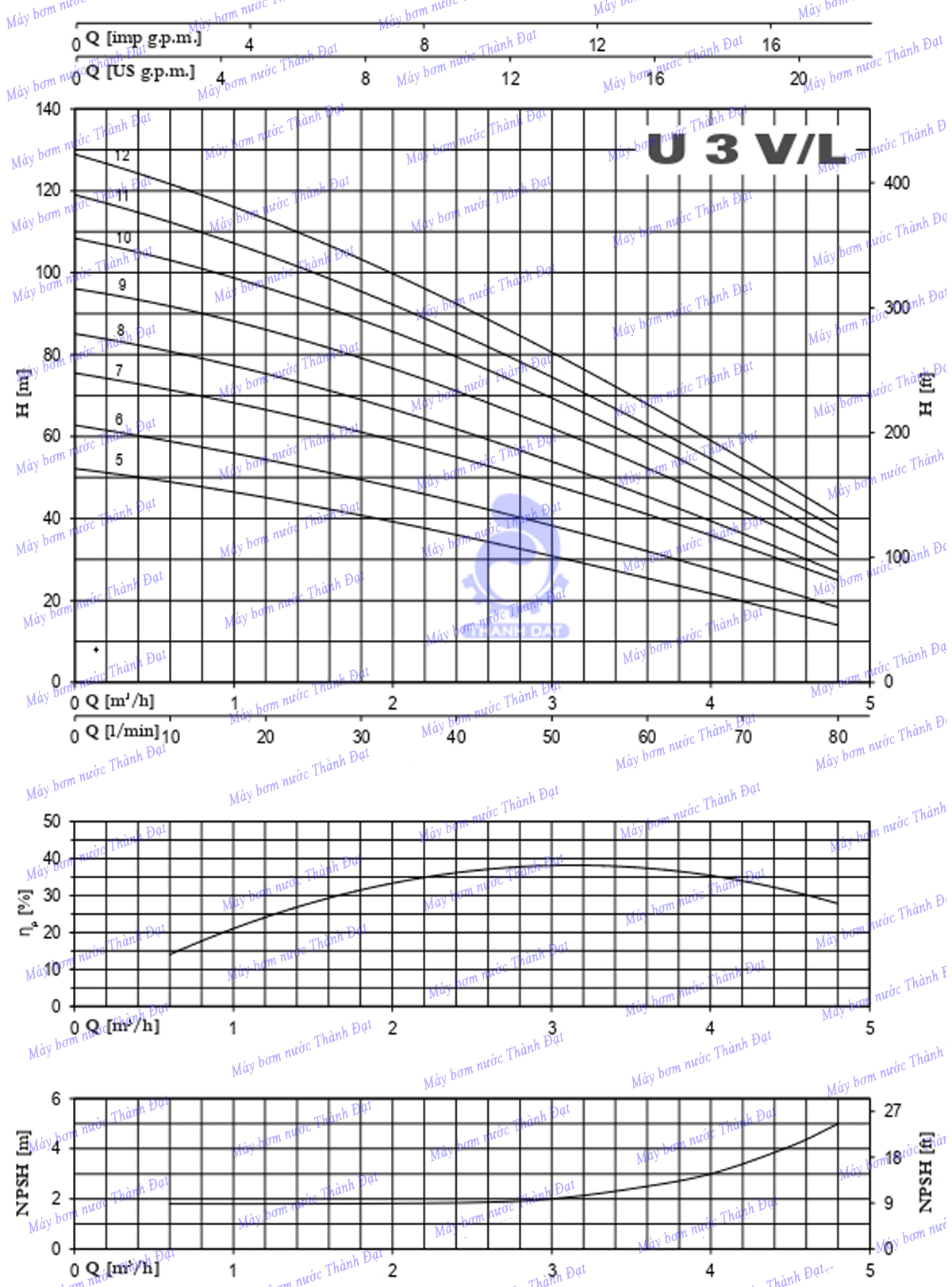 Bảng biểu đồ lưu lượng cột áp của Máy bơm trục đứng Pentax Ultra 3V