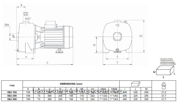 Bảng thông số chi tiết kích thước của máy bơm nước Foras KBJ bảng thông số chi tiết kích thước