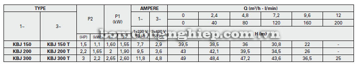 Máy bơm nước Foras KBJ bảng thông số kỹ thuật