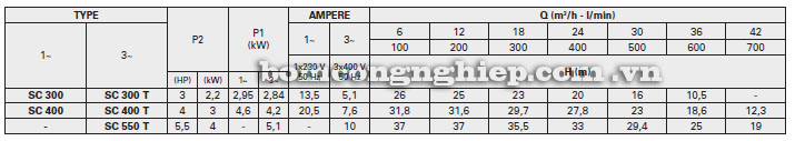 Bảng thông số kỹ thuật chi tiết lưu lượng cột áp của máy bơm nước Foras SC