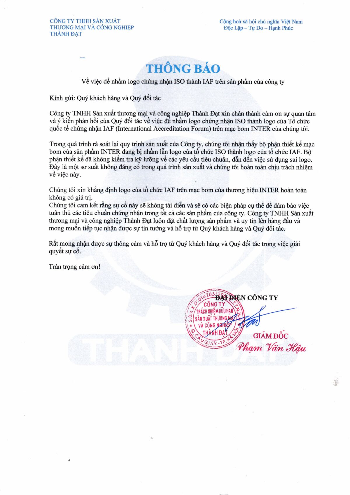 Về việc để nhầm logo chứng nhận ISO thành IAF trên sản phẩm của Công ty